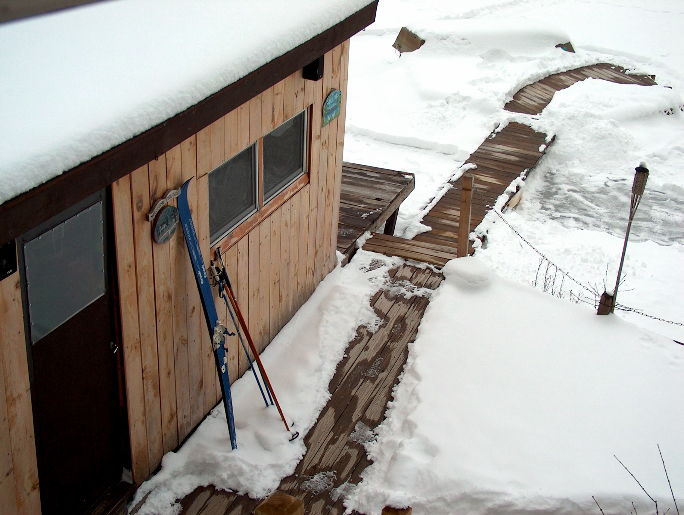 Yet another rain is coming tonight so I strapped (the old term), stepped into cross country skis as our golden ‘Mari’ picked out the ball of the day and we set out down lake. Conditions were good, slick not wet. We followed the first outlet which fills a small pond to and across a dirt road and into the woods on an old logging path. The path soon disappeared into new growth with an uneven obstacle filled journey ahead. The golden can go under and around small bush tree fallen log bramble and briar where the rabbits can go.