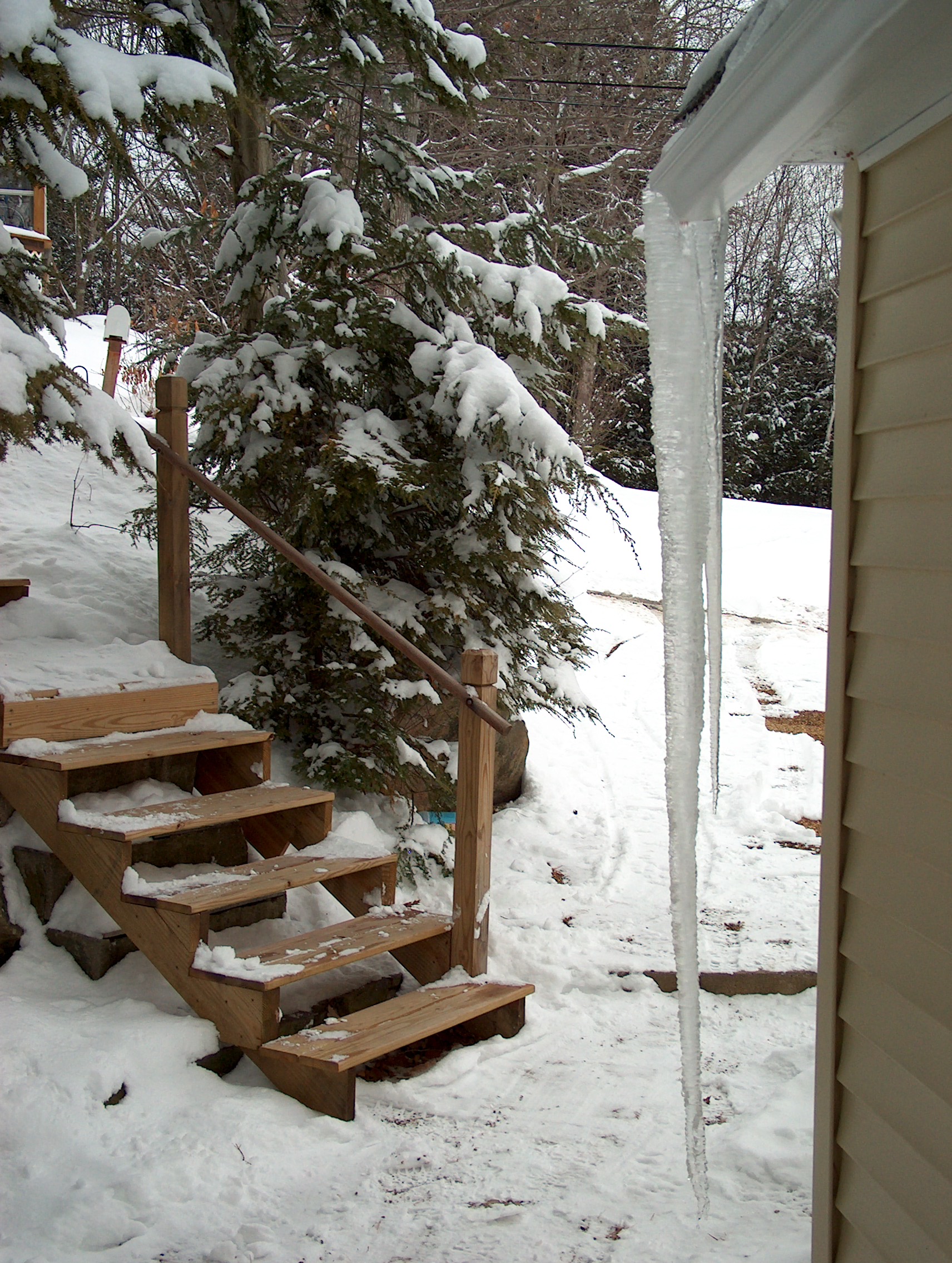 We climb the hill and follow tracks to the SW end of the wetland. A break in the trees frames the view. Home to the deer, to me it is a dear moment in viewing. With no easy way down I remove the skis and use the pole straps to bundle them. Now hiking in 4 to 12″ of snow I can follow a more direct route. We move up and down hill to gully to hill, jumping across streamlets and slow and careful on the weak ice of pieces of wetland.